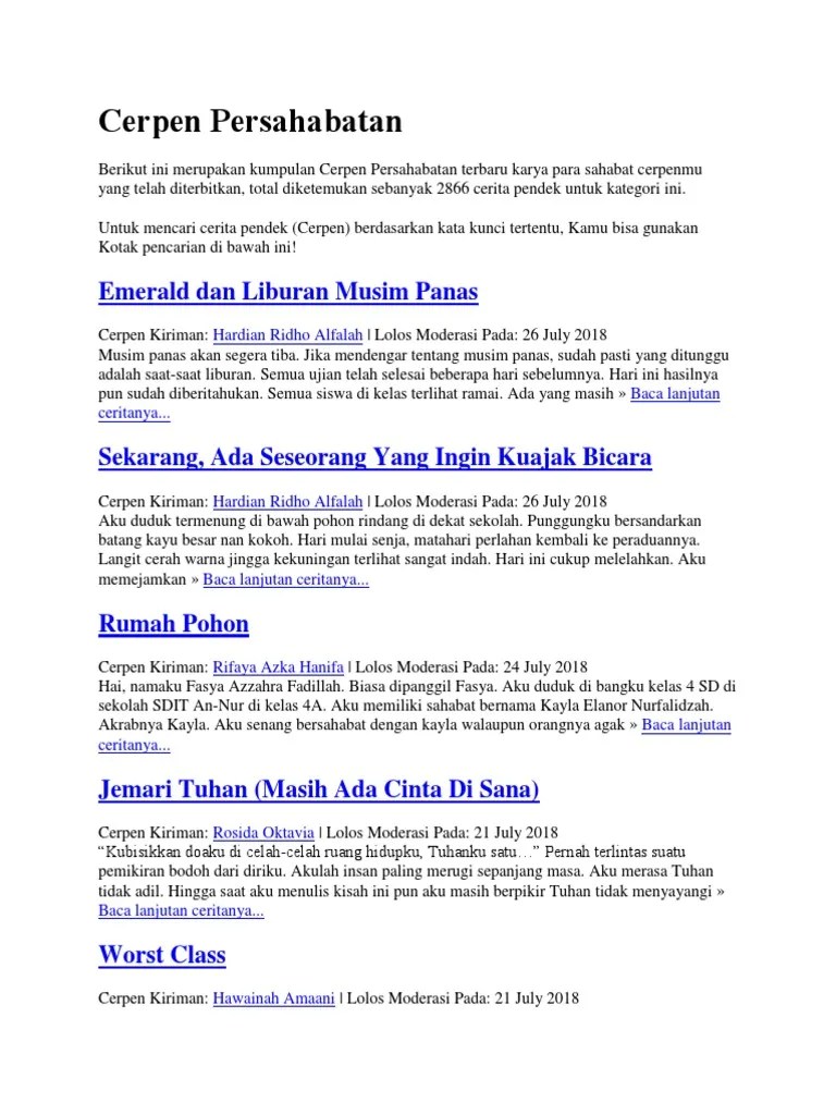 Dimana terdapat burung burung yang berkicau dengan merdunya. Gagasan utama yang menjadi dasar cerita jalannya cerpen. Berikut contoh cerpen tentang persahabatan cinta dan sedih . Inspirasinya, mengambil pengalaman pribadi di masa sma . Lupa tentang rasa ini atau bahkan padanya. Waktu itu hari pertama aku. Cerpen cinta romantis cerpen persahabatan cerpen remaja. Contoh cerpen cinta dan persahabatan yang singkat, romantis, sedih, dan lucu. Itu aku jadi deket banget sama aldi hingga kita berdua menjadi sahabat. Sahabat jadi cinta jodoh pasti bertemu, ya kisahku kali bercerita tentang perjalanan kisah cintaku dengan seorang pria. Ini adalah kisah cintaku yang . Bukankah itu kisah biasa biarkan saja ku simpan sampai aku lupa. Cerpen cinta romantis, cerpen persahabatan, cerpen remaja